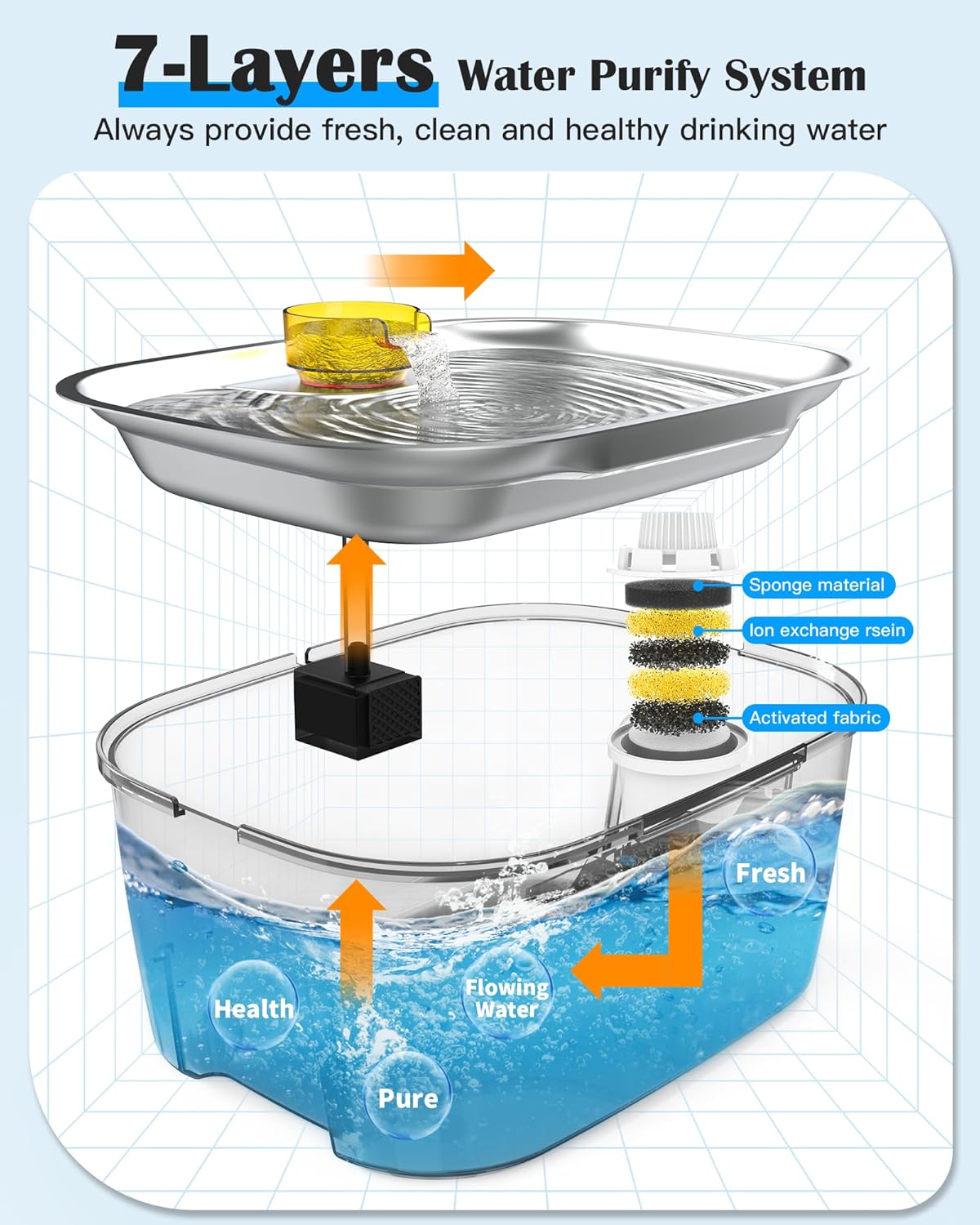 - 【7-Layers Filtration System】The filtration system of large dog water dispenser adopts a vertical filtration design, which will use the water on the water bowl to revert back to the water tank through a 7-layer cartridge, effectively removing hair and heavy metals from the water, while maintaining the water quality and increasing the oxygen content, and providing pure and healthy water for your pets at all times.